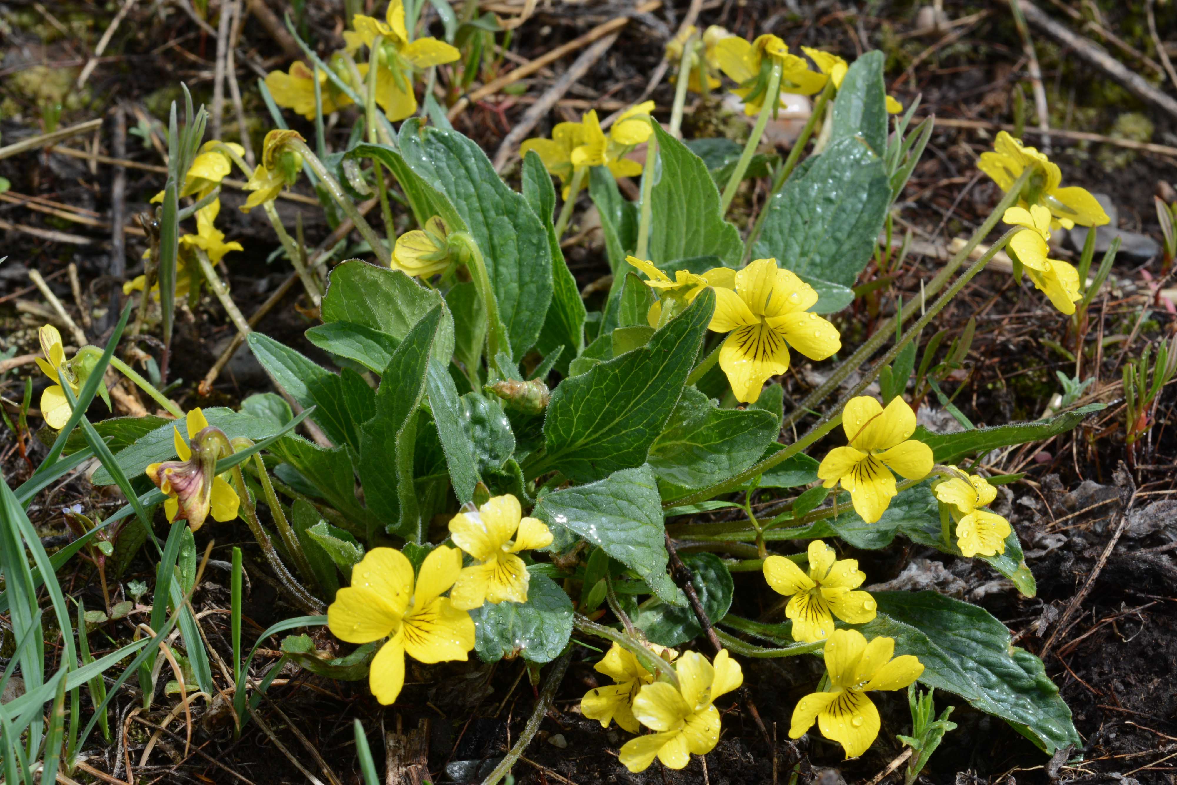 nestled atop sturdy 2-foot stems covered with linear leaves. Three kinds of native Yellow Violets (Viola nuttalii, V. praemorsa, V. vallicola) match introduced Dandelions in their