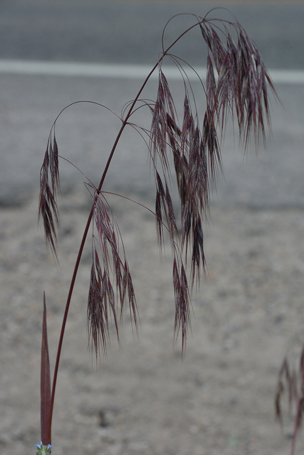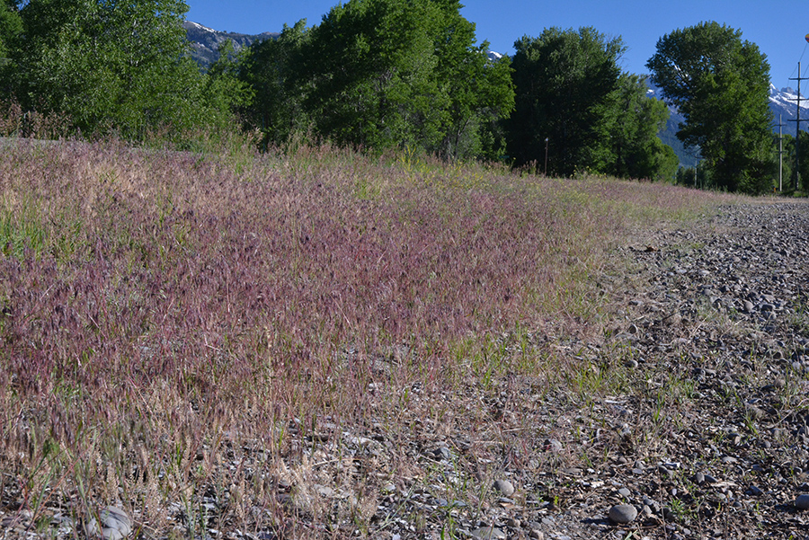 Cheat Grass, Downy Brome* – Bromus tectorum – The scourge of grasslands throughout the West, this quickly growing annual is unpalatable to livestock or wildlife due to its sharp, hurtful awns. It crowds out nutritious native grasses and changes the ecology of shrublands and grasslands by altering the fire regime: the fast-curing plants provide tinder for fires from spring to fall. Look for the purplish to brown patches spreading from roads up the slopes of our buttes.