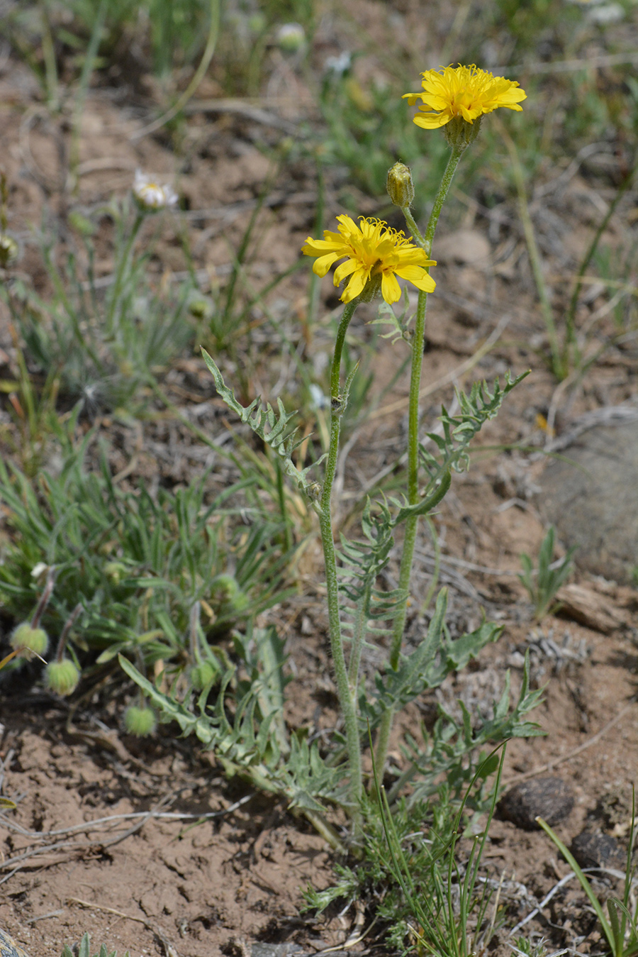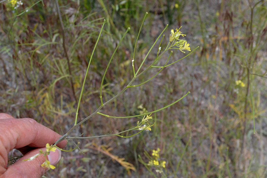 Tumble Mustard – Sisymbrium altissima – This 3-4’ tall, airy plant has ½”, 4-petaled yellow flowers and 3-4” very narrow fruits (siliques). The stem leaves are pinnately divided into narrow segments while the basal leaves are much broader and larger overall. This is a very invasive plant, which dries quickly, breaks from its roots, and tumbles its seeds across open spaces.