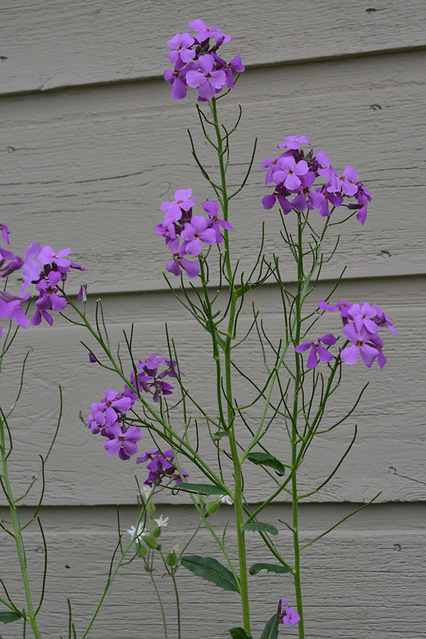 Dame’s Rocket* – Hesperus matrionalis – This attractive plant from Eurasia is a garden escape often found in our subdivisions. Note the 4 purple (sometime white) petals that flare at the ends. This is a large-flowered member of the Mustard Family and releases 1000s of seeds in a year. The fruits ripen into elongated siliques. These short-lived plants extend their roots quickly into new habitats, affecting wildlife values of aspen groves and the like.