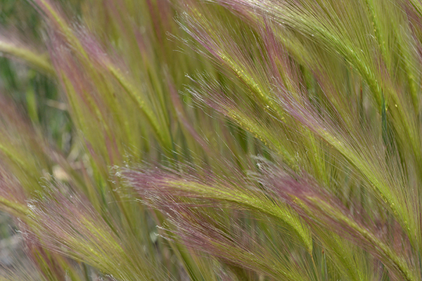 Foxtail Barley – Hordeum jubatum – Not quite waving amber waves of grain, this shining blond-to-rose-colored grass festoons road edges. While the 8-12” plants look soft and silky, their grains are encased in stiff spears (awns and glumes) that deter grazing animals. The barbed seeds easily attach to passing tires, shoes, and fur. This is a tenacious native.