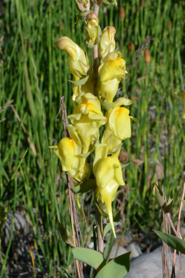 Dalmatian Toadflax looks like our garden snapdragon. The yellow flowers with long spurs born at the tops of straight 2-2.5’ stems. Blue-green, stiff, arrow shaped leaves clasp the stems.