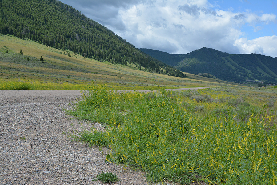 Yellow Sweet Clover – Melilotus officinalis – A member of the pea family hailing from Europe, this 2-5’ plant. can fix its own nitrogen, enabling it to grow on the poorest of soils. The tiny, yellow, pea-like flowers have a sweet fragrance from the presence of coumarin. In moist hay, coumarin can be converted by fungi into a poisonous anticoagulant, called dicoumarol—toxic to cattle. Natural area managers target Yellow Sweet Clover for its aesthetic and ecological alteration of our beautiful grassland and shrub habitats. In Jackson Hole it is well established along roadsides and buttes.