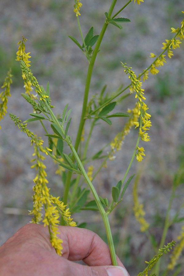 Yellow Sweet Clover is identifiable by its three-parted leaves and pea-like yellow flowers on 3-4′ stems.