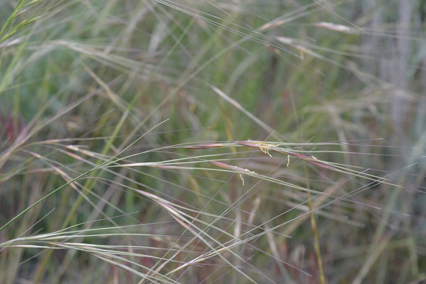 HespComa_fl_AntflS_62514_1aWeb Published June 30, 2014 at 900 × 601 in Sage Habitat Floral Additions – July 1, 2014 Needle-and-Thread – Heterostipa comata – has elegant but sharp “awns” 4-5″ long.