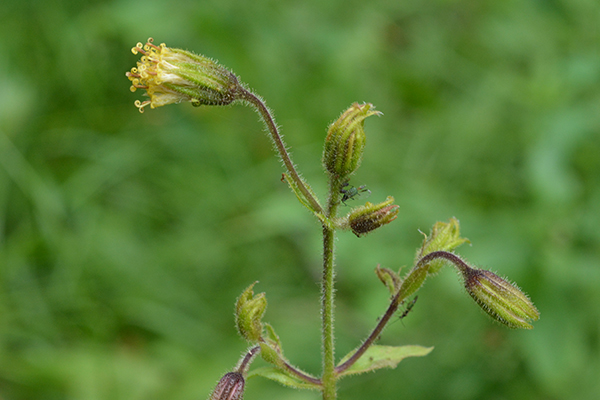 Looking closely, you may see a row or two of tiny “disc” flowers with pollen being pushed up. They start blooming at the base and gradually continue row by row up to the tip. These 5’ plants with large 6-8”, rough, oval leaves are found in moist meadows.