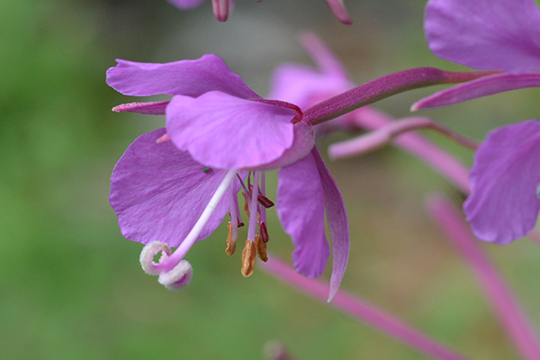 *Quiz answer: Fireweed – Chamerion/Epilobium angustifolium – The 8 anthers open sequentially releasing pollen. Pollen grains are linked by microscopic hairs which become entangled in the hairs of its bee pollinators. These same micro-strings attach readily to the 4-parted stigma which has little bumps. In each flower, the anthers develop first, then the 4-lobed stigma expands, to avoid self-pollination. The plants bloom from bottom to top.