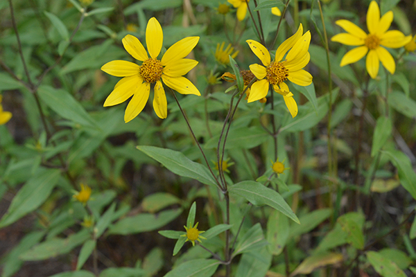 The 2”-3” long, neat, oval leaves with pinnate veins are held opposite each other. The flower heads are surrounded by tidy rounded bracts, and you may notice the 8-10, broad, petal-like ray flowers are slightly darker toward the center. In bee vision, this slight change in hue creates a bull’s-eye pattern. Pollinators have a perfect landing pad from which to gather nectar and honey.