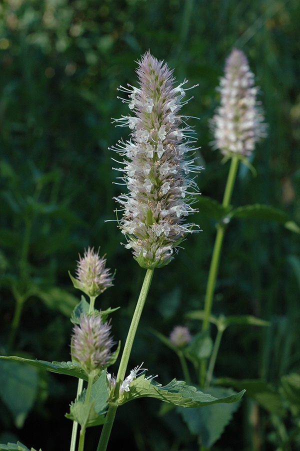 Looking closely at Nettle-leaf Giant Hyssop – Agastache urticifolia – you can see the “irregular” whitish flowers (with five fused lobes) with long anthers sticking out. The 4 pointed sepals are pinkish. The oval, toothed leaves are aromatic and sit opposite one another, each pair set at 90-degree angles from the one below. The 2-4’ stems are square. These are characteristics of the Mint Family.