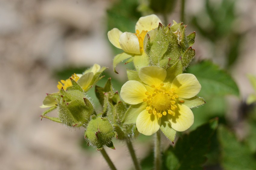 Flowers are 5-petalled with many anthers circling a cone of many pistils. White Cinquefoil Potentilla arguta is the most commonly seen species at this time and mostly yellow, not white. For precise ID, one counts up to 25 anthers, notes the roughly marked stigmas on smooth ovaries forming a slight cone in the center, and sees several flowers held tightly together on sticky stems.
