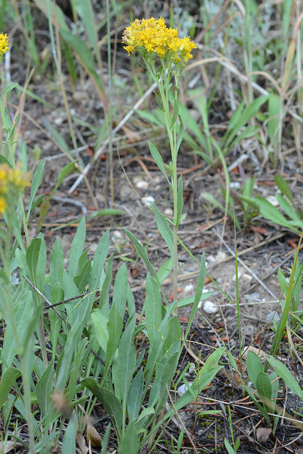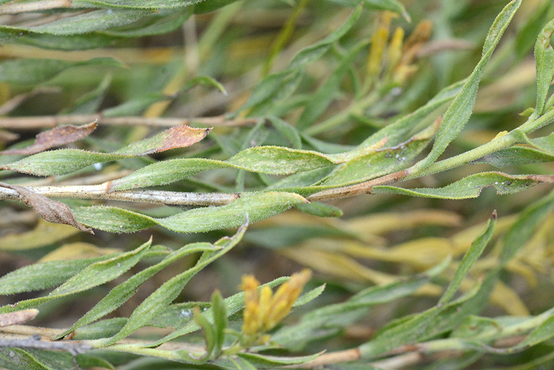 var. lanceolatus has hairy upper stems and often hairy leaves which are mostly 2-6 mm wide. Involucral bracts are hairy. More common and low growing at 6-18” high than var. viscidiflorus (not shown.)
