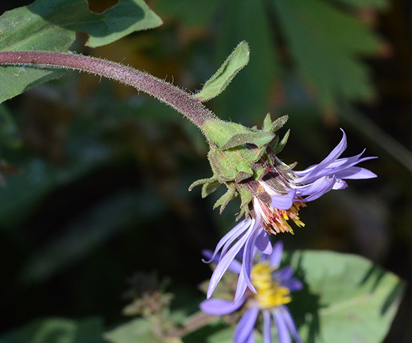 Their flower heads have sticky bracts and stems, and its thick stems tend to zig-zag. Flower heads have deep blue to purple ray flowers surrounding the yellow to rusty disc flowers. Lower leaves are much larger than those along the upper stems.