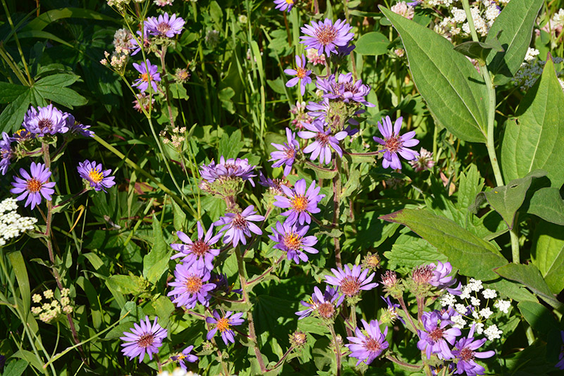 Pacific Aster (Symphiotrichum ascendens) forms colonies of blue along roadsides and smaller patches in more wooded areas.