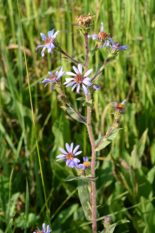 They bloom at various heights: mowed, grazed, or just left alone. One way to tell these blue asters from others is to look at the venation of their elongate leaves. The veins outline elongate areas.