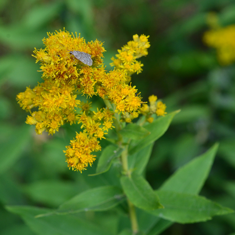 Canada Goldenrod has many slightly toothed, pointed, 2-3” leaves alternating up 2-4’ stems. Tiny heads contain about 13 ray flowers. Here the many small composite flowers bunched together create a show signaling in pollinators who can perch and wander about for the goods of pollen and nectar. Also, there are many other tiny and large insect crawling in and about the flower heads, some munching, others laying eggs, some just hiding from predators.