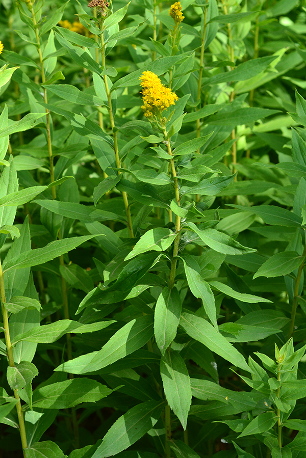 Sticky Goldenrod (Solidago simplex) has smooth petioles and heads with only about 8 ray flowers. Flower heads can be a bit resinous or sticky.