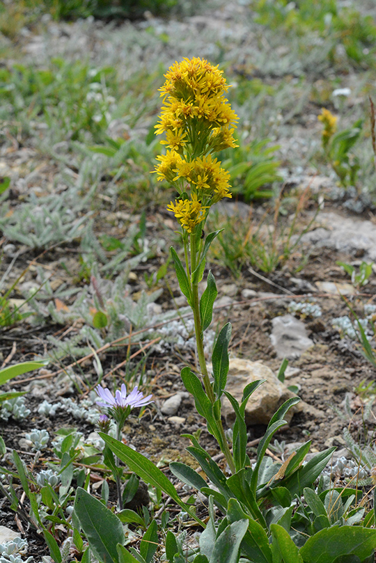 For plant nerds: Two other common goldenrods are smaller, smooth all over, with most of their larger leaves bunched near the base. Rocky Mountain Goldenrod (Solidago multiradiata) is distinguished by ciliate hairs long the petiole of the basal leaves and 13 ray flowers per head.