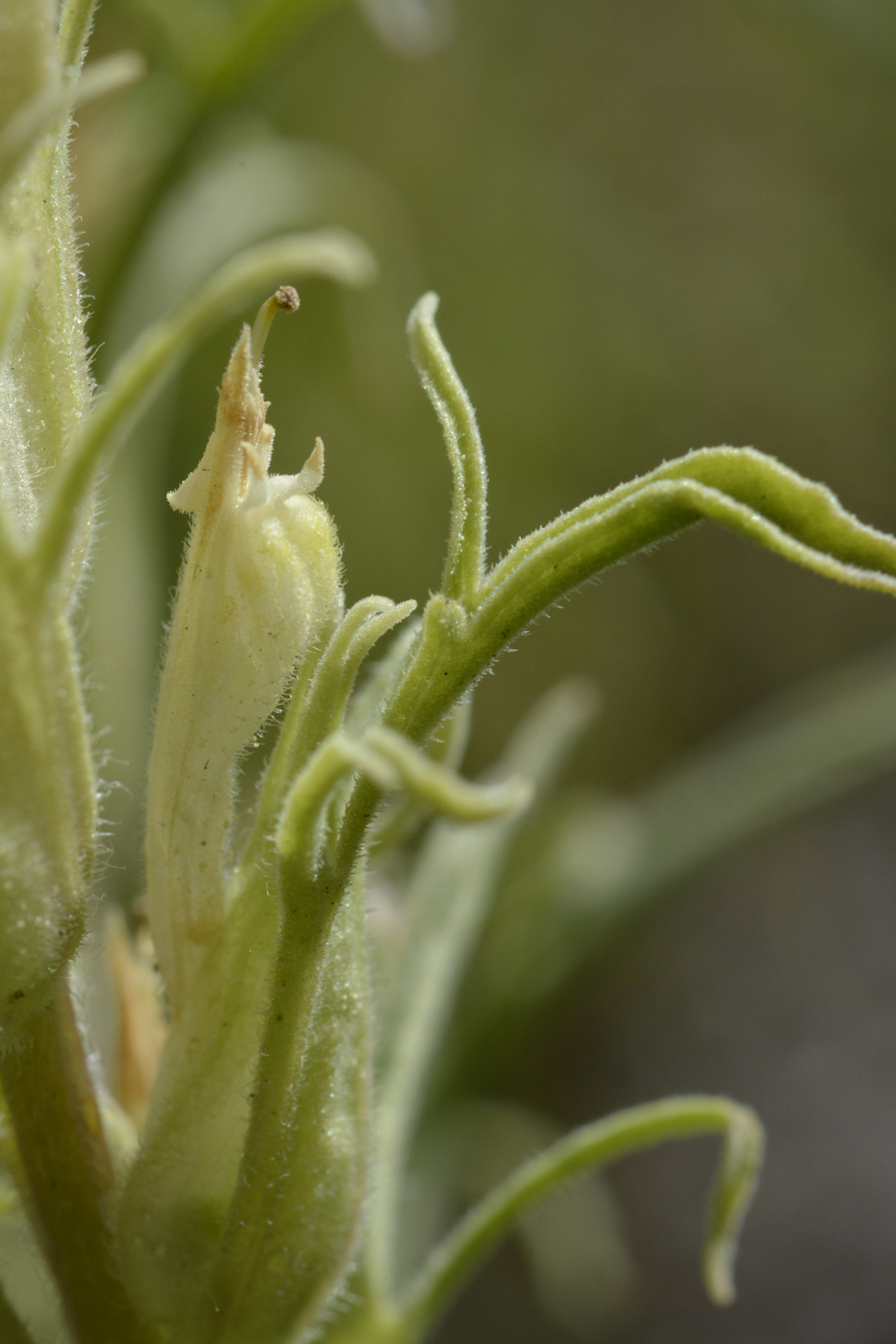 Pallid Indian Paintbrush – Castilleja pallescens – is pale yellow, the calyx (fused sepals) is cleft more deeply in front and back than to the sides. Ultimate calyx lobes are acute to acuminate. Note the large expanded pouch: lip, and the stipma jutting out the top of the flower tube.