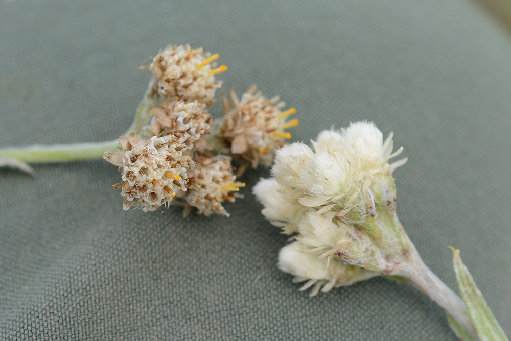 In the photo, the heads with male flowers are on the left with anthers bearing pollen, and the heads of female flowers are on the right with delicate white stigmas with many extra bristles. Pussytoes often make seeds without fertilization (apotomictic) and/or are polyploids (having extra sets of chromosomes) which can make ID more complicated.