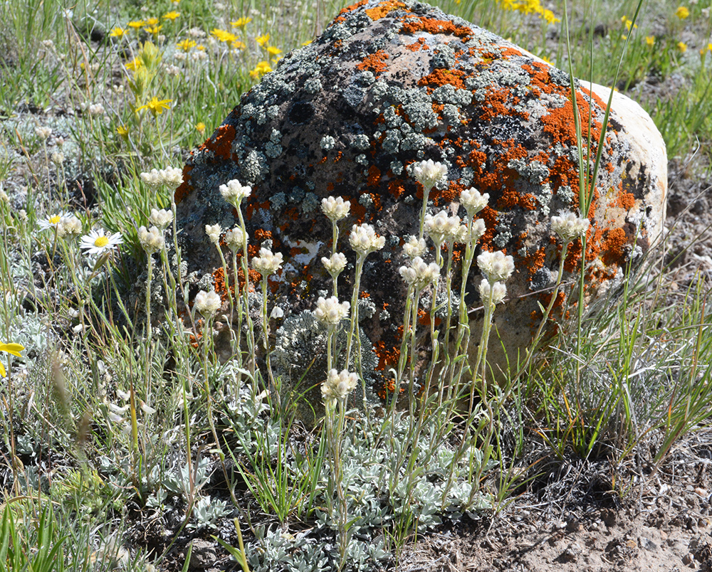 Pussytoe – Antennaria sp. – flower heads have only disc flowers and scaly inconspicuous bracts and, therefore, look very small and plain compared to many of our composites. Pussytoes in general are easy to ID by their “pussytoe”-like flower heads. Heads have either male or female disc flowers on separate plants (dioecious).