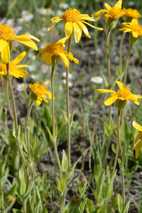 Twin Arnica – Arnica sororia – is having a good year around Antelope Flats and foothills. The bright yellow flowers stand upon 1’ stems with 2-3 pairs of narrow opposite leaves with a few more at the base.