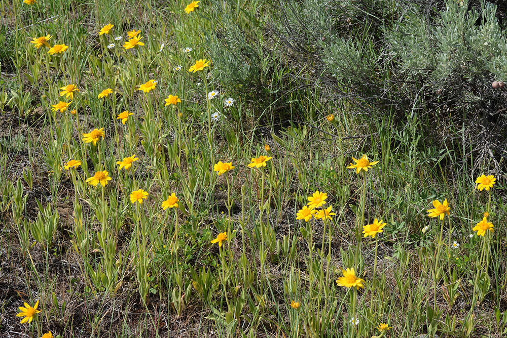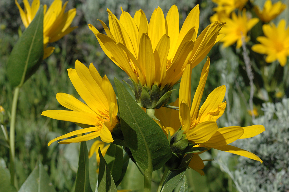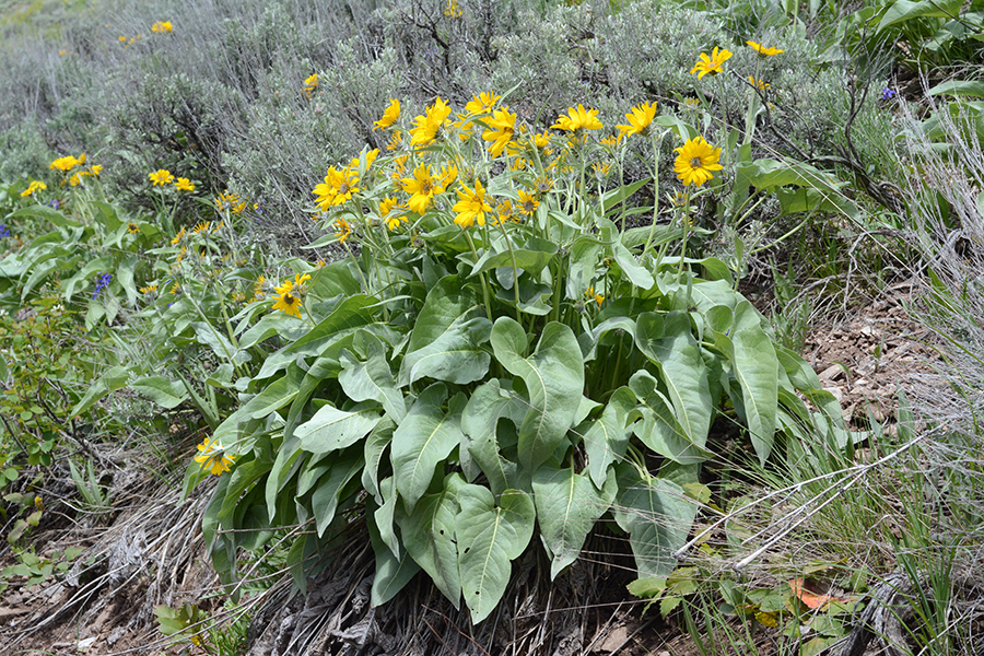 Arrowleaf balsamroot – Balsamorhiza sagittata – still dominates many slopes and sage flats in Jackson Hole right now. It has arrow-shaped, slightly hairy, large 1-2′ grayish leaves all growing on long petioles from the base. Stalks have 1-2 large flowers with yellow ray flowers and disc flowers. Fresh flowers smell like chocolate, and the roots have a balsam scent.