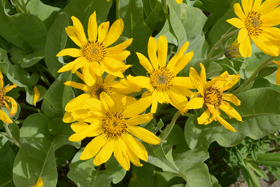 Several orange-yellow flowers alternate up the stem along with smaller leaves. Mule’s Ears tend to be found in relatively moist, often heavy clay soils.