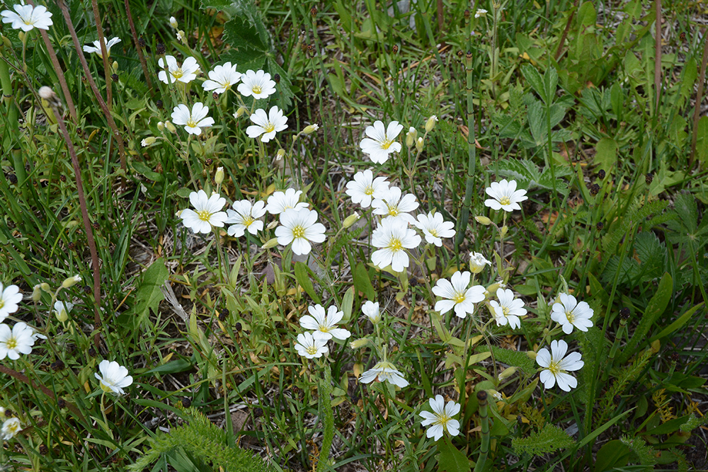 Field Chickweed – Cerastium arvense – is aptly named as it is often found spreading in fields as well as sunny trail sides.