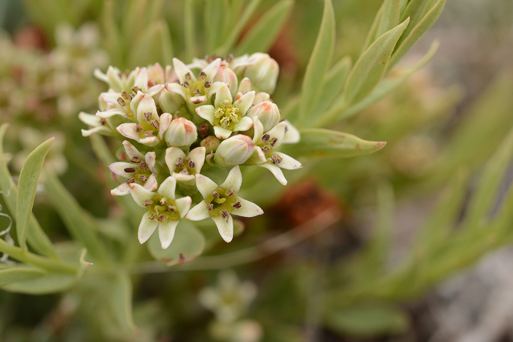 This 6″ plant is a hemiparasite, with stubby root structures (haustoria) which attach to hosts such as pussytoes, grasses, and aspens to name a few. It is also the alternate host for the comandra blister rust (Cronartium comandrae), a rust fungus that affects lodgepole and other pine species in North America.