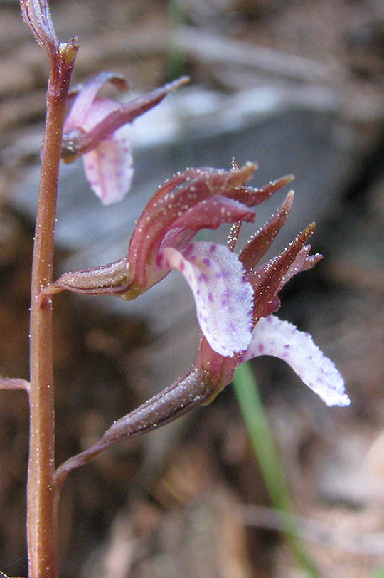Botany is a hands-on occupation: take a 10x handlens, find some examples (not in a national park) and do some dissection to see if you can distinguish the species. Below is picture of a typical unit to start with: full unit left, taken apart to show: bract which provides added color and protection; sepals forming a tubular calyx; and the petals (corolla) creating an elongate tubular flower with a greenish “lip”. Anthers and pistil are secured within.