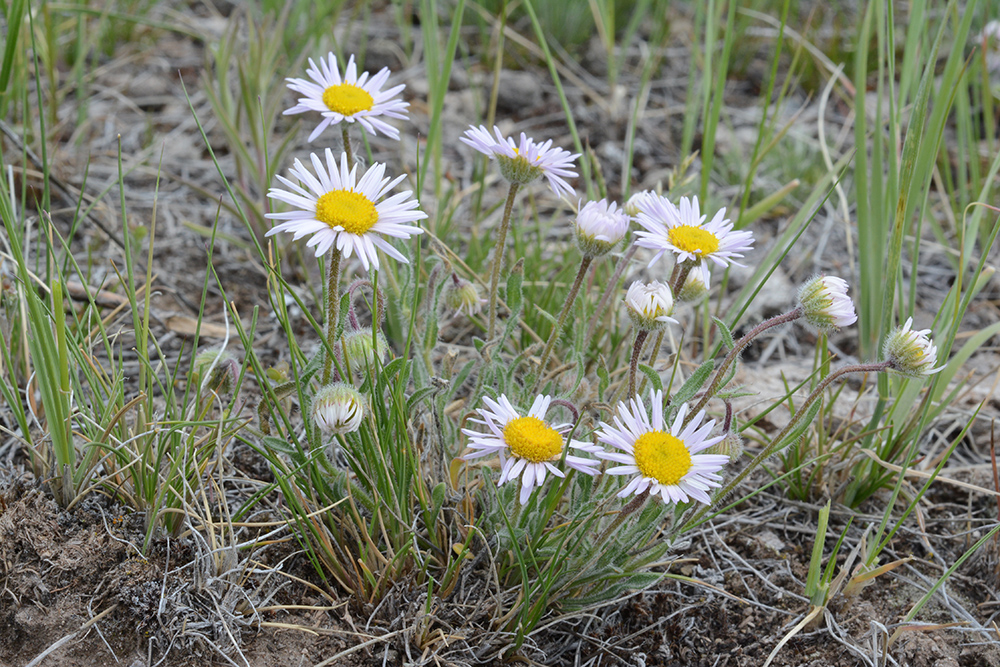 Low growing Shaggy Fleabane – Erigeron pumilus – is common on many dry knolls. Fleabanes have heads surrounded by a ring of equal-sized bracts and many narrow ray flowers. In this species the maturing flower heads nod, the 1-2″ leaves are very narrow, and hairs stick straight out like the hairs on a frightened cat! Hairs reduce water loss by shading the surface of the leaf and reducing velocity of wind currents. Hairs are common on plants growing in dry locations.