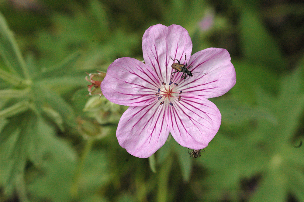 Sticky Geranium – Geranium viscosissimum – is one of the most recognized plants in our area. The 5 radial, pink-to-blue petals are perfect landing pads for a variety of insects. They can easily follow the fine “nectar guides” to the center to where pollen and stigmas await. The 10 anthers mature first. Later 5 sticky stigmas arch outward to catch the pollen. This arrangment is another strategy to assure cross-pollination.