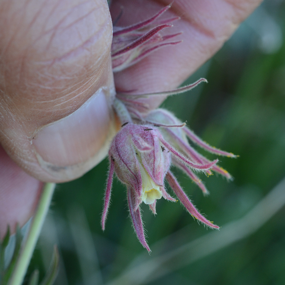 Prairie Smoke – Geum triflorum – has clusters of three dangling flowers with pinkish sepals that almost hide the yellow petals.