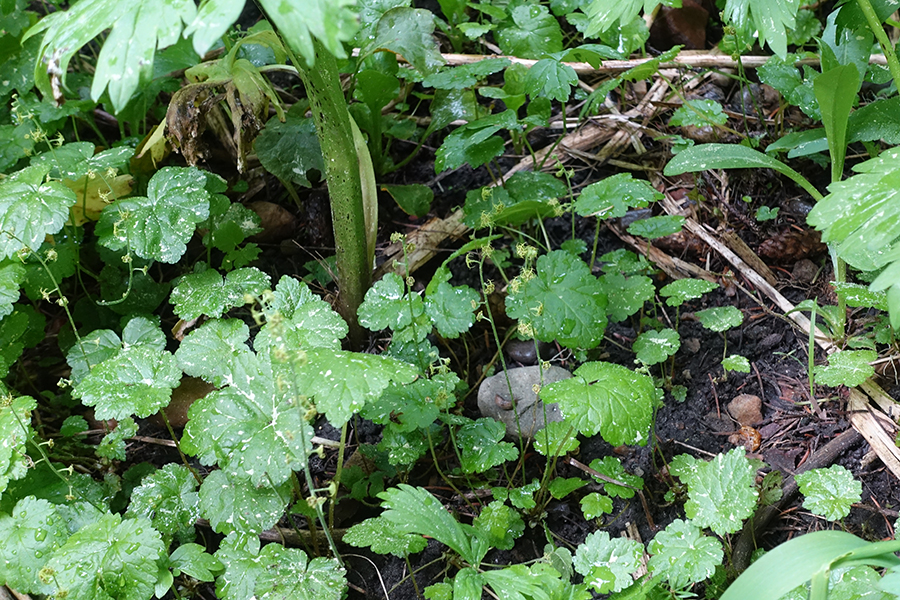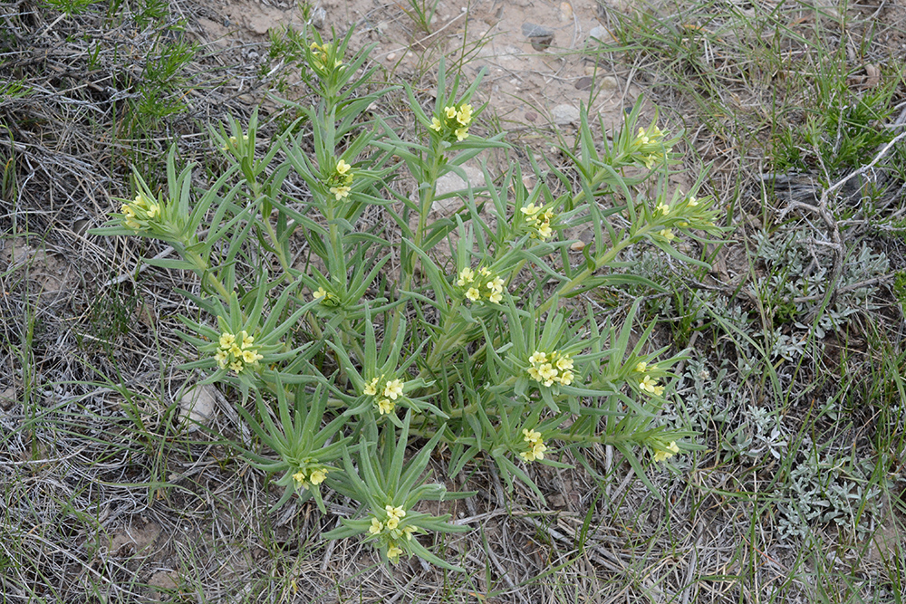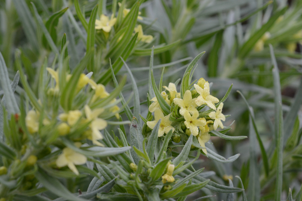 Stoneseed – Lithosperma ruderale – has delicately scented yellow flowers tucked amidst the leaves near the top of robust 1-2’ plants.
