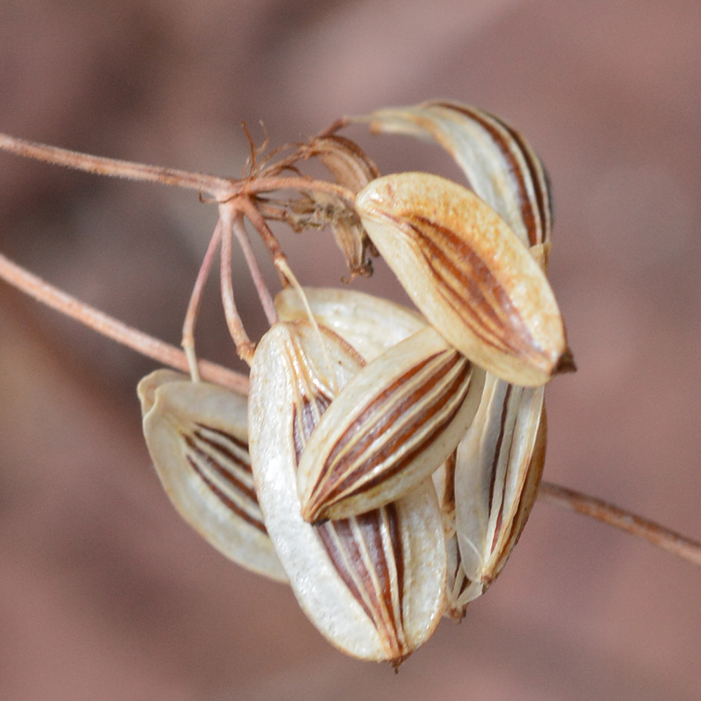 Each flower will have dried fruits that split into two single seeded parts=schizocarps. Here they are flat with a few ridges and wing-like edge. Fruits are important in ID of the Carrot Family.