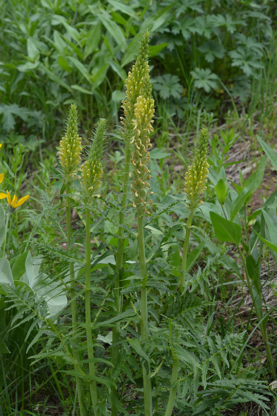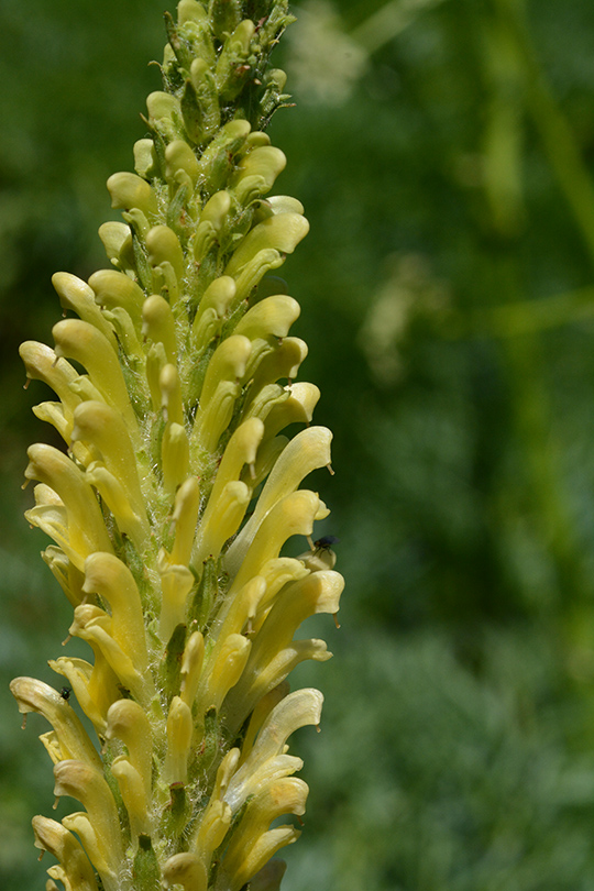 Parrot-head Indian Paintbrush – Castilleja pilosa var. longispica – Also pale yellow, the calyx is cleft to about the same length into 4 equal, pointed lobes. The inflorescence overall has puberulent to sparsely villous hairs. Plants are many-stemmed and generally decumbent at their bases. No photo, but in your dissection look for the calyx with equally sized, sharp pointed lobes.