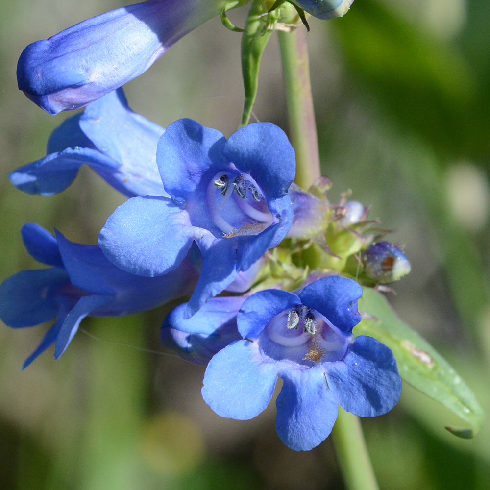 Our penstemons are blue (rarely white) and are pollinated by bees. All penstemons have opposite leaves and 5 petals forming a tube. Inside are four arching stamens, each with paired anthers. A fifth stamen that looks like a hairy tongue lies at the entry. This “staminode” doesn’t have pollen but does direct pollinators (so the researchers say).