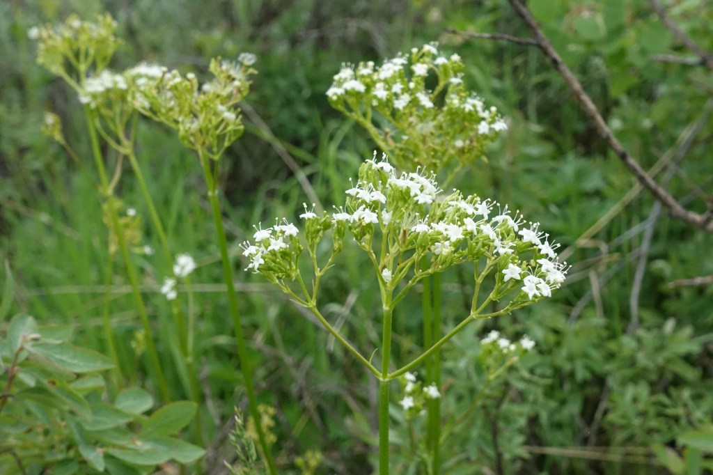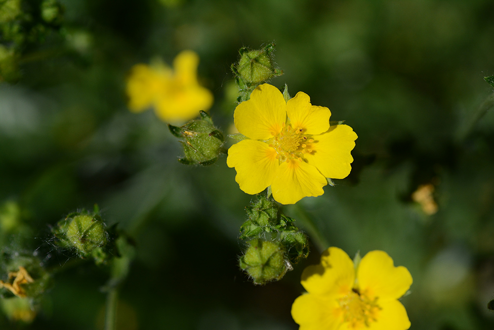 Cinquefoils – Potentilla spp. – are just coming out with their cream to yellow flowers on top of 2’ stems. About four common species with a variety of subspecies complicate precise identification, with several other low growing species also found in the county. Generally, Cinquefoil leaves are divided into 5 (cinque) or more leaflets arranged either in a palmate or pinnate arrangement. Flowers are held near the top and have 5 green sepals and 5 yellow petals with many stamens and pistils. Examining the small flower features with a 10x handlens is critical to accurate ID. Regardless of identity, cinquefoils are very important for many pollinator species, and are host plants for several different butterflies.