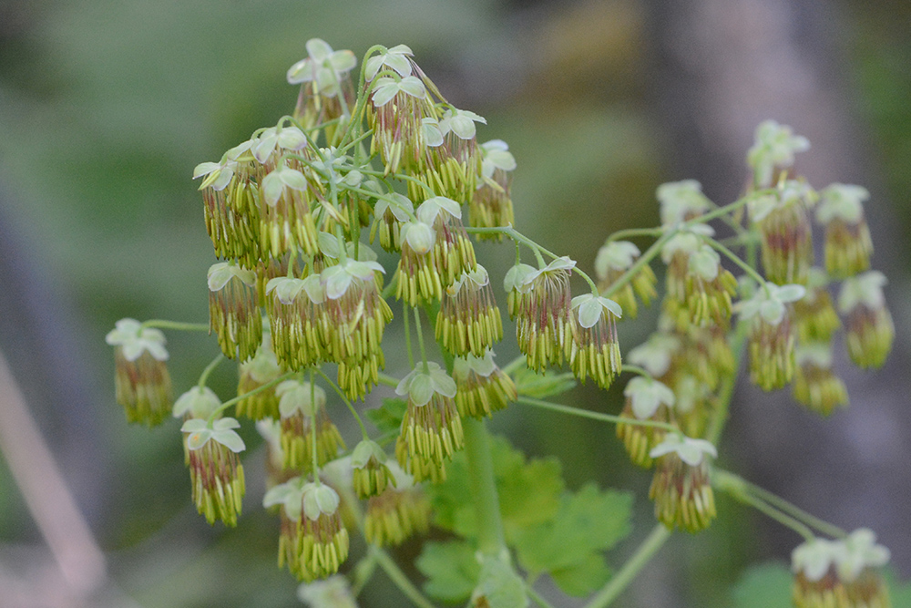 Look for the umbel of the inflorescence. The tiny flowers are held out at the end of stalks arranged around a central point like ribs of an umbrella.