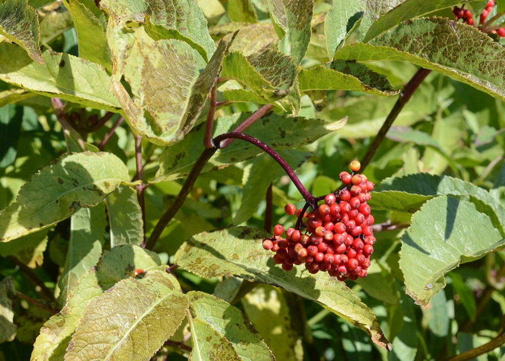 There is also a variety – S. r. var. melanocarpa – with almost black fruits. Elderberries have a rank fragrance if you break the warty, finger-thick stems. The fruits and other plant parts are poisonous with cyanogenic glycosides, so don’t eat unless you cook them thoroughly.