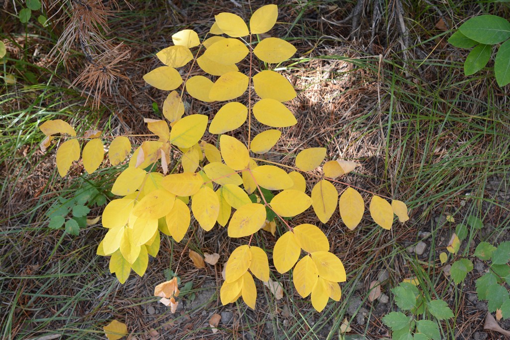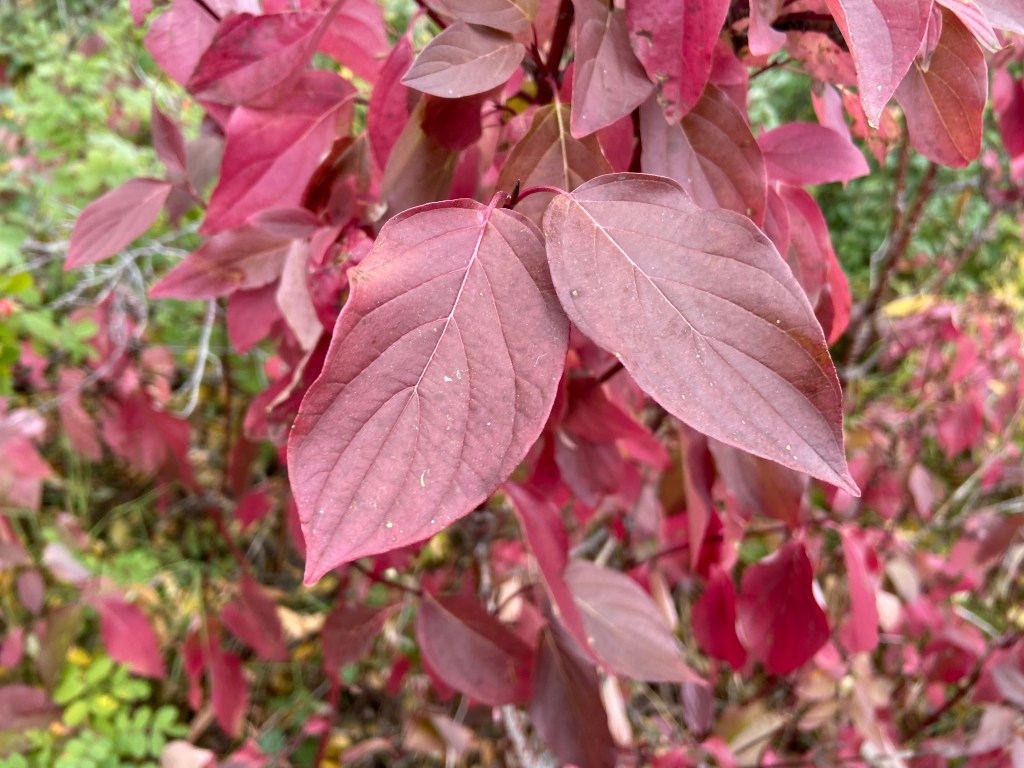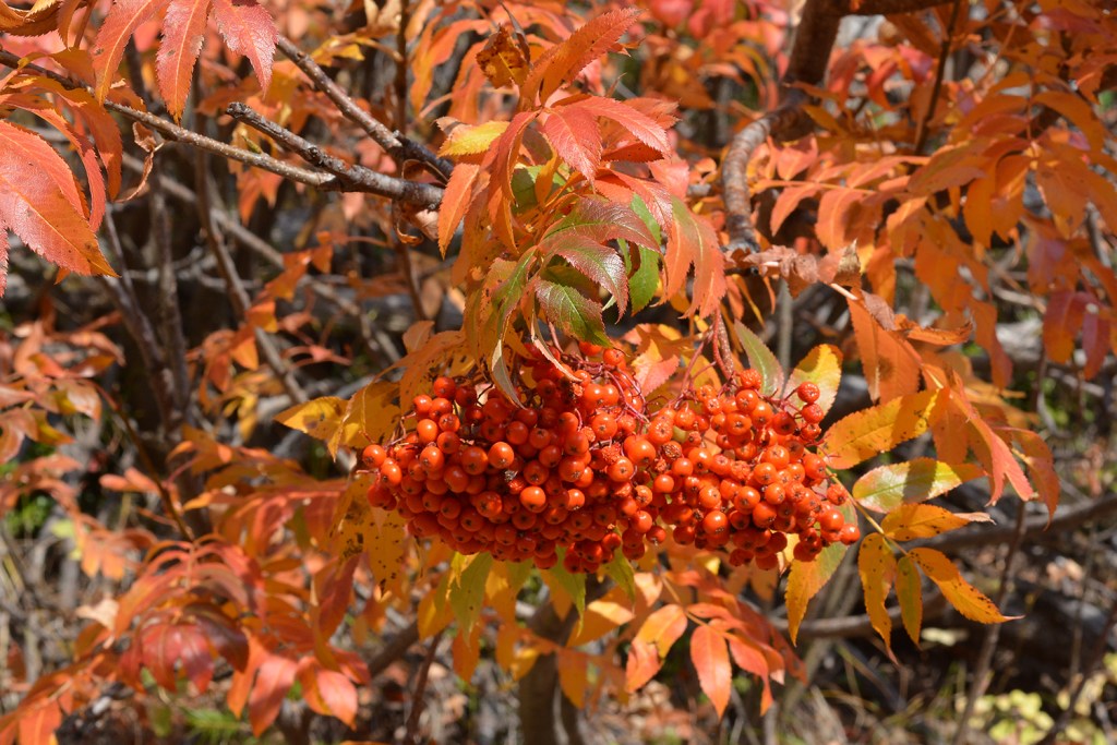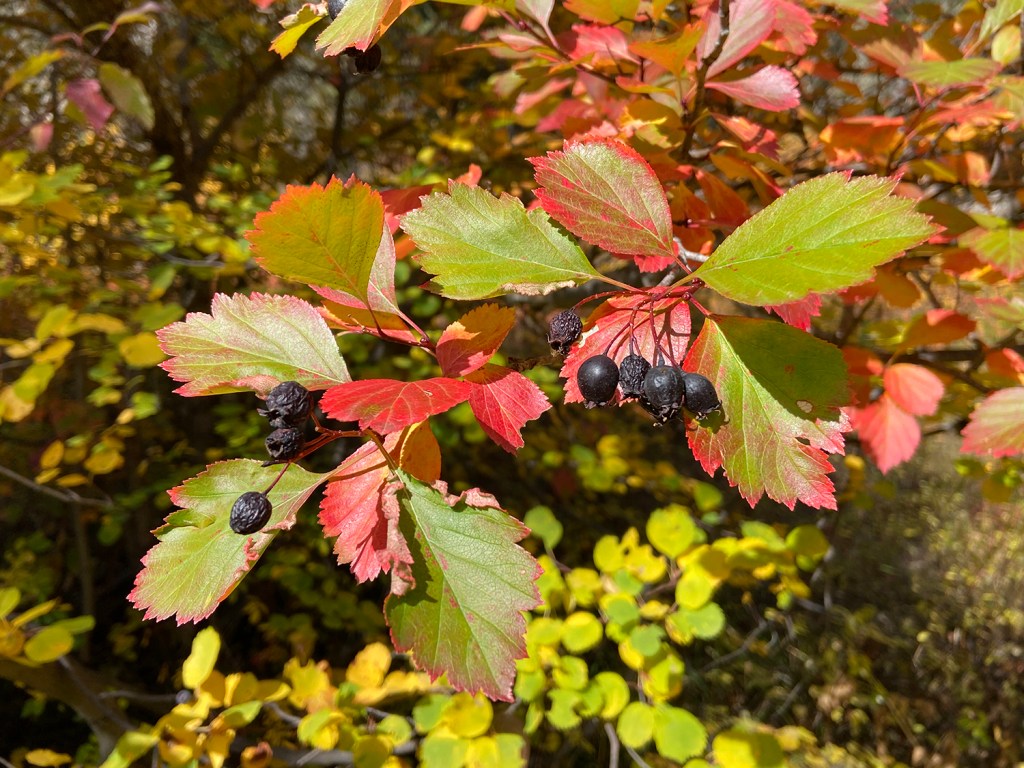 Despite the 1” thorns on the branches, bears have no problem clambering into the 15-20’ high shrubs. Since late August, the green, multi-toothed leaves have become a shiny reddish hue.
