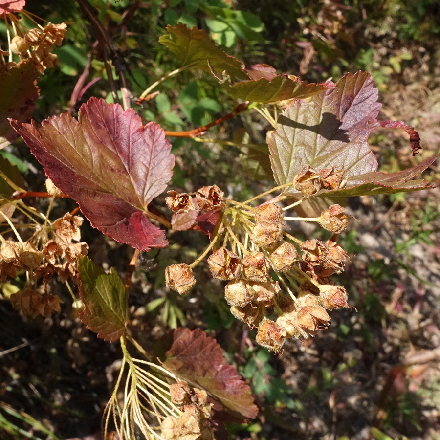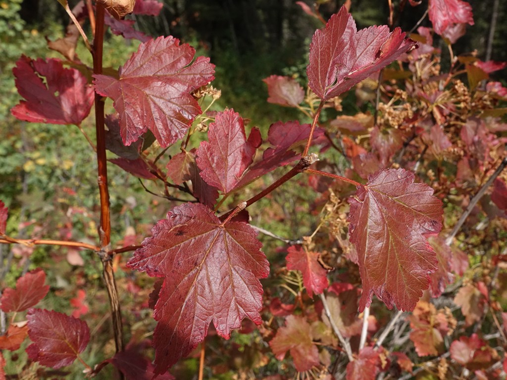 Ninebark – Physocarpus malvaceus – grows on relatively dry slopes, mostly south of Jackson along the Snake River Canyon. The 4-5’ shrubs stand out for their maroon colors. The leaves are very similar in shape to our mountain maples but are arranged alternately on the stem.