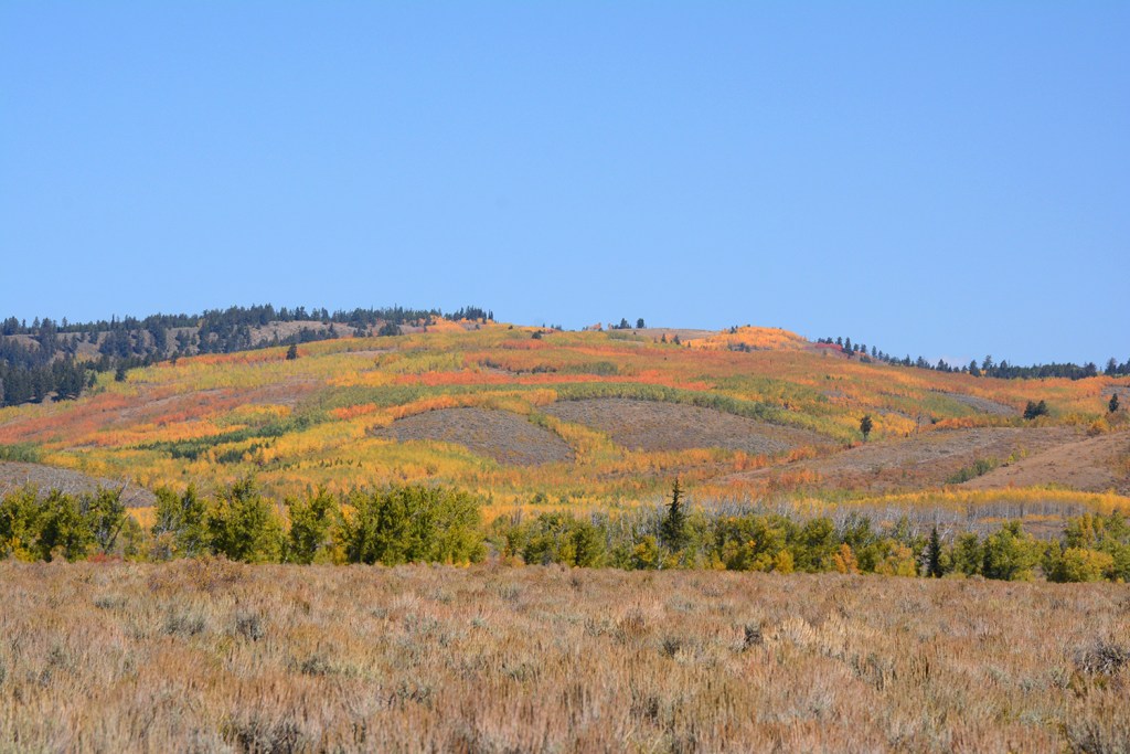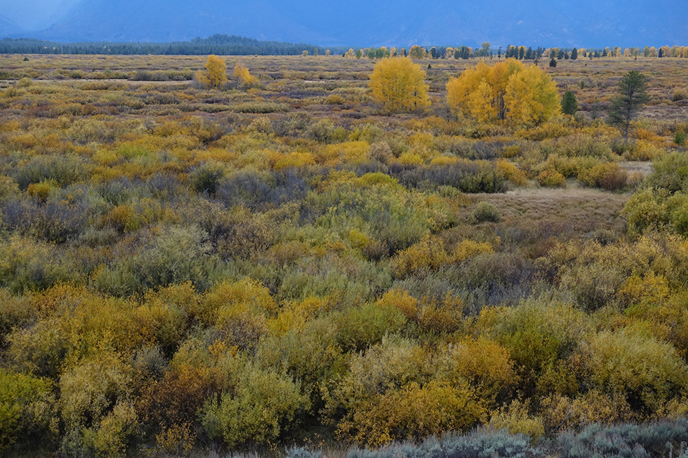 Many species of Willows – Salix sp. – blend their colors on Willow Flats seen from the Jackson Lake Lodge