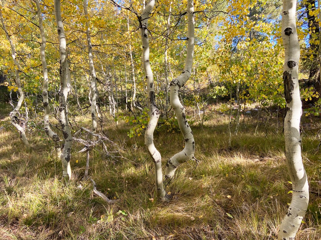 Aspens – Populus tremuloides – are the backbone of our fall color. Aspens typically grow in clones: many stems arise from connected underground roots, so many many trees are one genetic individual. Notably aspen clones have different shades of yellows to orange as seen on the south end of Shadow Mountain right now.