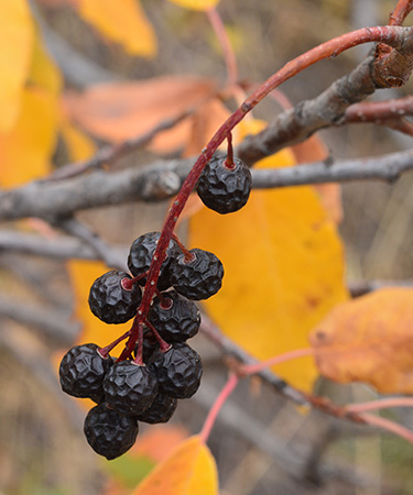 that range from yellow to pinkish-red. The dangles of purple-black fruits are fast disappearing to nourish birds and bears.