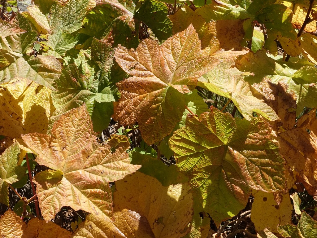 Large 5”- wide, lobed leaves of Thimbleberry – Rubus parviflorus – glow yellow on canyon slopes