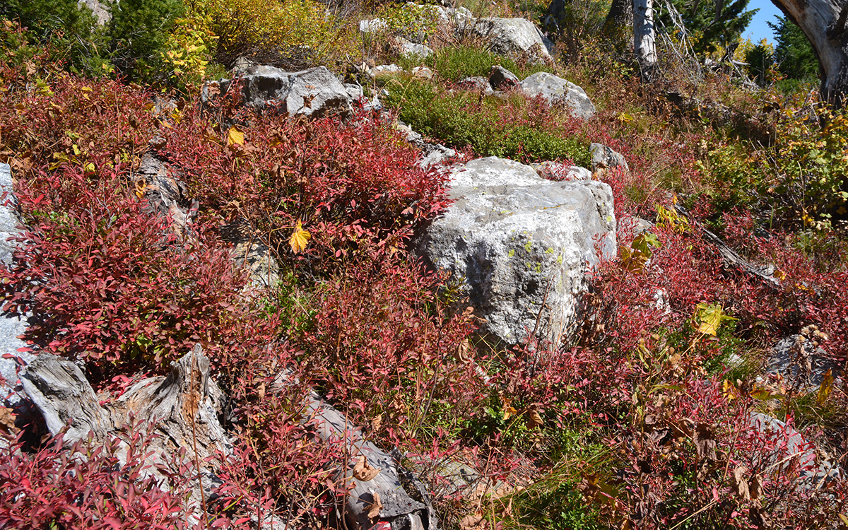 The 2-3’ shrubs stand out along the north side of Jenny Lake and elsewhere.