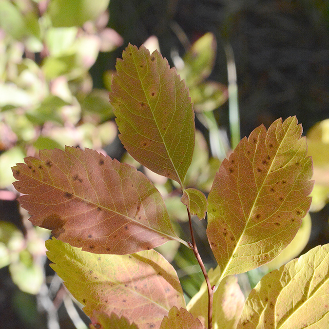 Despite the 1” thorns on the branches, bears have no problem clambering into the 15-20’ high shrubs. Since late August, the green, multi-toothed leaves have become a shiny reddish hue.