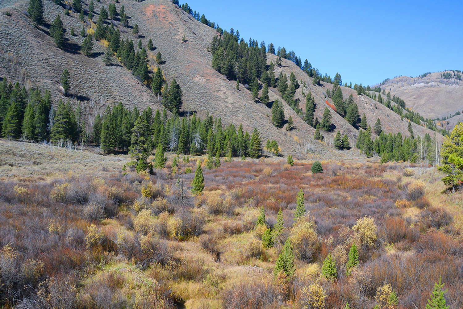 Cottonwoods – Populus angustifolia, P. acuminata. P. balsamifera – are shading creek sides and the Gros Ventre and Snake River flood plains.