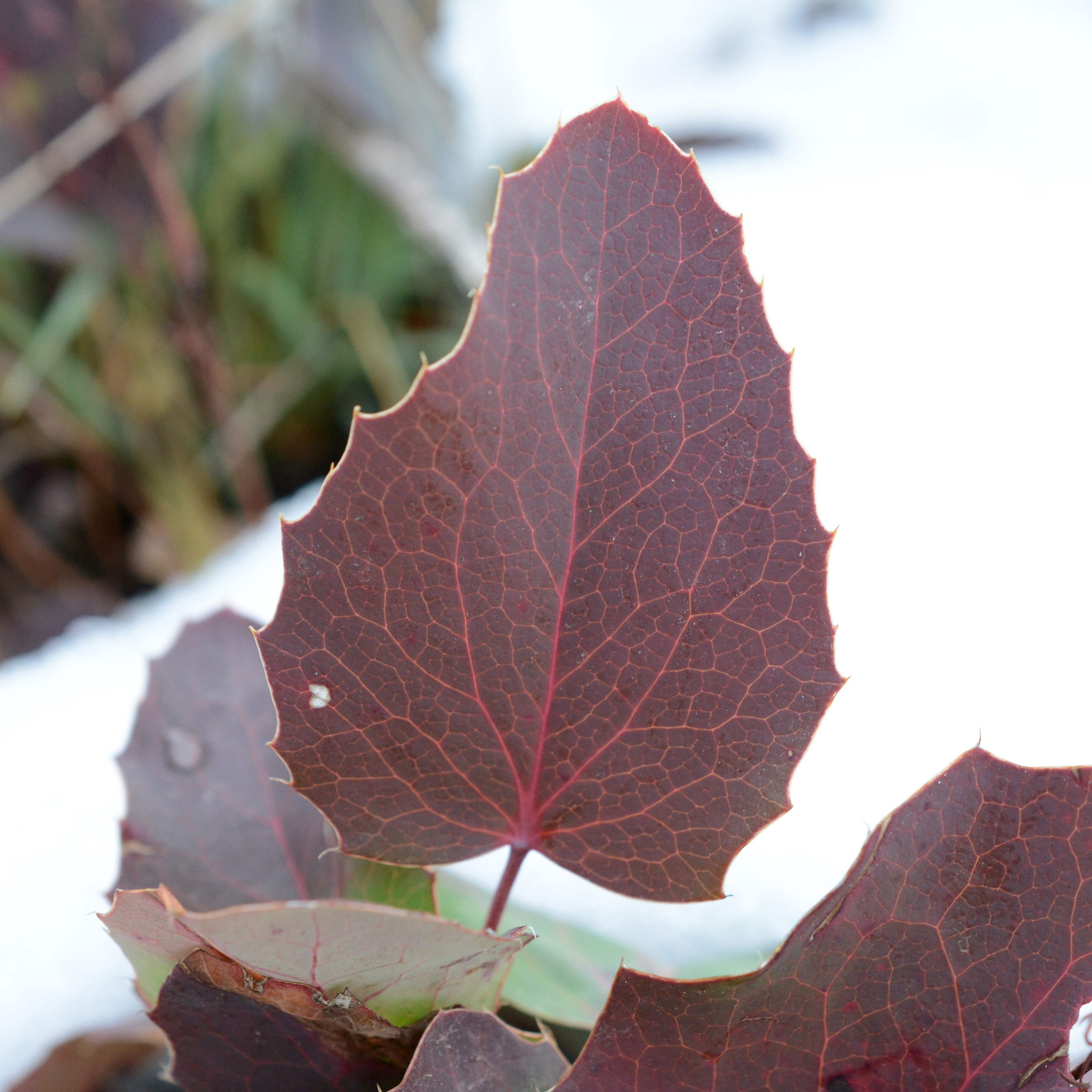 Oregon Grape – Mahonia repens – has evergreen, compound leaves. The lobes have sharp-teeth reminiscent of holly leaves.